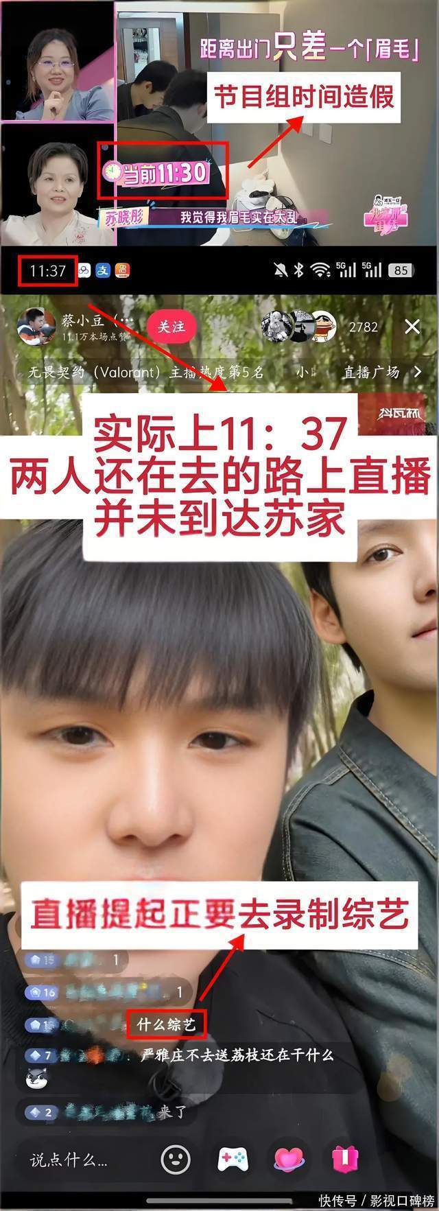 与其悠哉游哉行为形成鲜明对比的是字幕标注的“计划10分钟出门”。此类无中生有的拱火操作让事件的冲突升级,也让部分观众不满。当事人苏晓彤此前灵动俏皮的小白花形象被推翻,取而代之的是各种审判,比如“以自我为中心”“没有时间观念”之类的。而据演员郑伟的直播录屏显示,11:37他还在去苏晓彤家的路上,该时间点显然与节目组显示的“11:30三人已准备出门”存在出入。