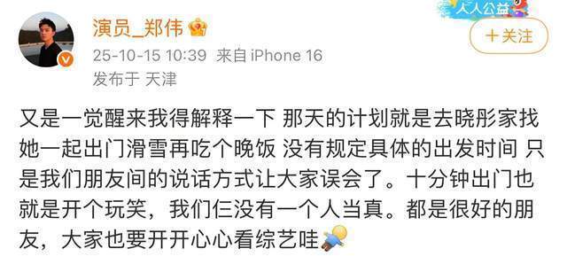 演员郑伟在其社交平台发文,就苏晓彤“画眉一小时”事件的争议做出澄清。据他所言,当天计划是先去苏晓彤家集合,后共同出门滑雪。吃完饭后,并没有规定具体的出发时间。至于视频里提到的“十分钟出门”只是朋友间的玩笑调侃,实际上大家并未当真。最后他再度强调和苏晓彤,付伟伦是多年好友,希望网友们不要过度解读私下互动,这样才能使三人之间的好友关系得到维系。
